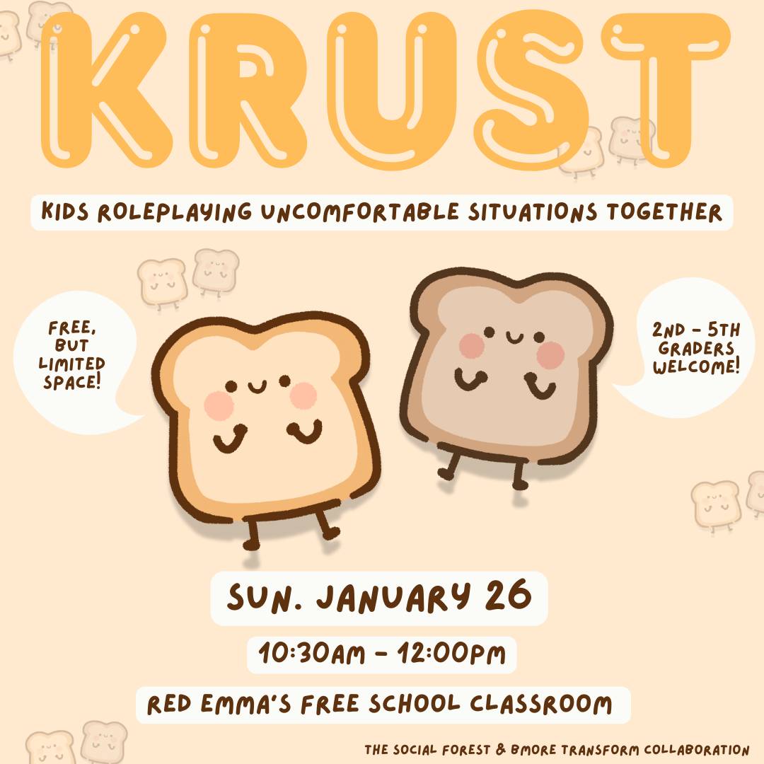 The Social Forest KRUST for Kids & More Community Workshops! As we wind down the year, I thought it would be appropriate to not only look forward to the workshops planned in the New Year but also reflect on some of the community workshops from the past couple months. Upcoming Community Workshops!!! I'm excited to announce my collaboration with Bmore Transform: KRUST: Kids Roleplaying Uncomfortable Situations Together at Red Emma's on Sun January 26 from 10:30am to 12:00pm. I've been impressed...